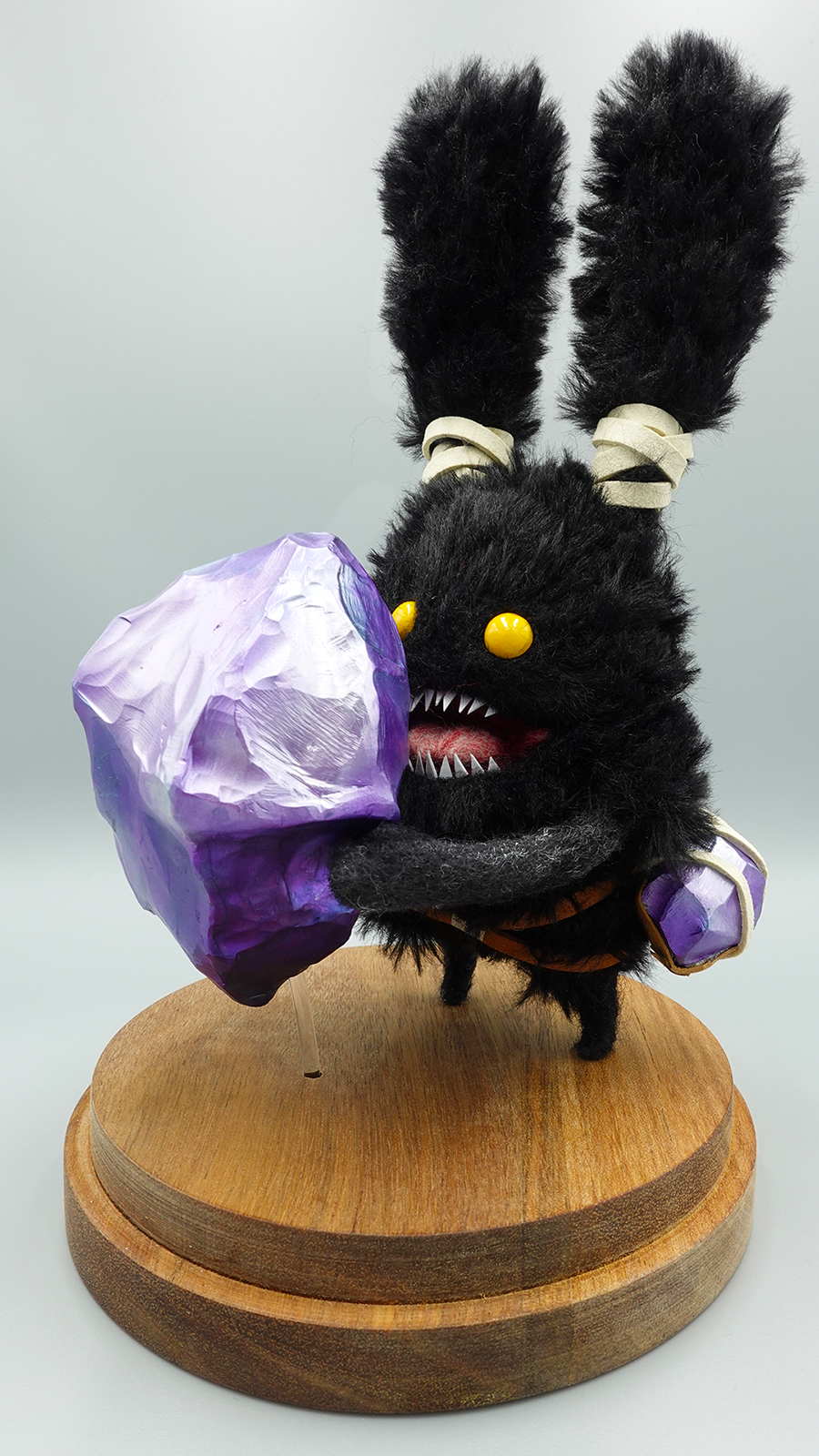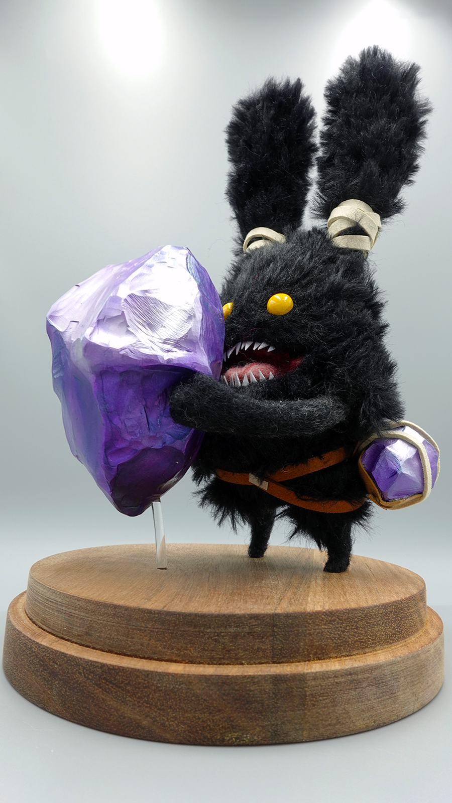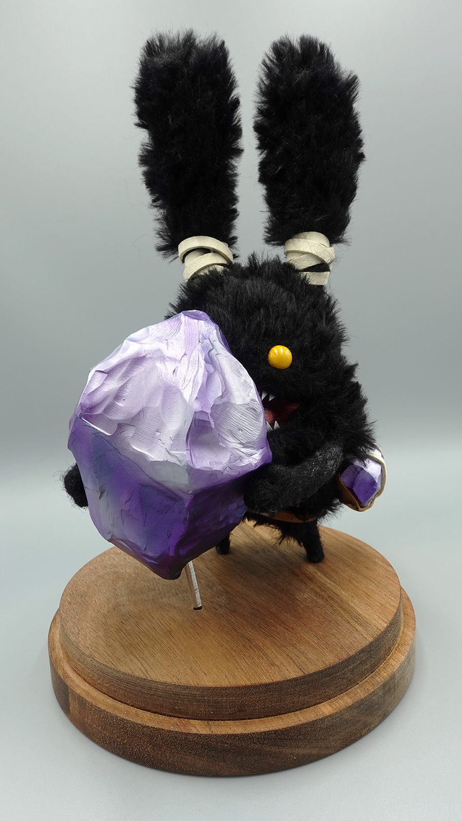 A needle felt sculpture of a monster character found in the game Final Fantasy 14 (FFXIV). Originally created for entry into an art contest sponsored by the game. Not only does this piece have armatures, but its features and accessories are made of multiple materials (epoxy, leather, plastic). And has allowed this piece to start transcending needle felt into more of a sculpture piece.